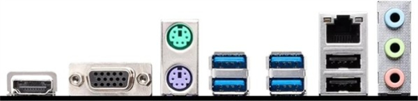 Anschlüsse extern: 1x HDMI 2.1 TMDS (iGPU), 1x VGA (iGPU), 4x USB-A 3.0 (5Gb/?s), 4x USB-A 2.0 (480Mb/?s), 3x 3.5mm Klinke (Realtek ALC897), 1x RJ-45 (1000Base-T, Realtek RTL8111H)
